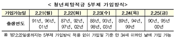 21일은 1991년, 1996년, 2001년생, 22일은 1987년, 1992년, 1997년, 2002년생, 23일은 1988년, 1993년, 1998년, 2003년생, 24일은 1989년, 1994년, 1999년생, 25일은 1990년, 1995년, 2000년생이 가입할 수 있다. 1987년 2월 22일생까지는 5부제 가입방식 적용 없이 가입일 기준 만 34세 이하인 날에 가입할 수 있다.