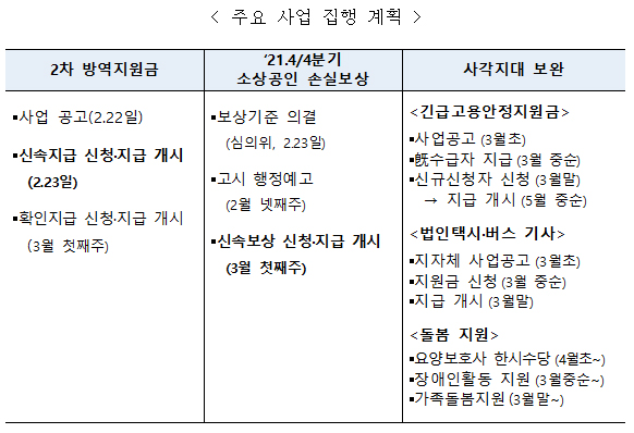 취약계층 등 사각지대 보완을 위한 긴급고용안정지원금(특고·프리랜서), 법인택시·버스기사 소득안정자금 등은 3월 내 지급 개시하고 방역 지원 예산은 배정 즉시 집행을 시작한다.