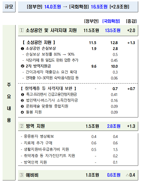 국회 본회의를 통과한 추경안은 정부 원안인 14조원보다 2조9000억원 순증됐다. 원안에서 3조3000억원을 증액하고, 예비비 예산에서 4000억원을 감액했다. 국채 추가발행 없이 추가 소요 재원은 특별회계 세계잉여금 및 기금 여유자금을 활용해 충당하기로 했다.