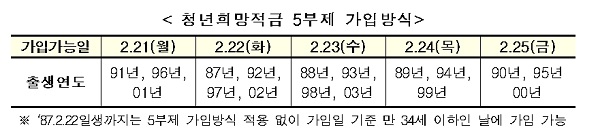 첫 주(21일~25일)에는 5부제를 운영하며, 출생연도에 따른 가입 가능일의 운영시간 중 가입할 수 있다. 둘째주(28일~3월 4일)에는 영업일 운영시간 중 출생연도와 무관하게 가입 가능하다. 다만 3월 1일은 영업일이 아니므로 가입 신청을 받지 않는다.