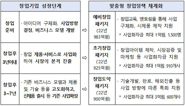 창업패키지는 성장단계별로 3개 사업으로 나뉘며 예비창업자를 위한 예비창업패키지, 창업 후 업력 3년 미만 창업기업을 위한 초기창업패키지, 업력 3년 이상 7년 미만 창업기업을 위한 창업도약패키지가 있다.