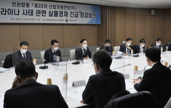 ▲ 박진규 산업통상자원부 1차관(왼쪽 세번째)이 23일 서울 대한상의에서 ‘민관합동 제20차 산업자원안보 TF회의’ 일환으로 열린 러시아-우크라이나 사태 관련 실물경제 긴급 점검 회의를 주재하고 있다. (사진=산업통상자원부)산업부는 에너지 수급 차질 시 석유와 석탄을 각각 미국·북해·중동과 호주·남아공·콜롬비아 등에서 대체 도입할 계획이다.