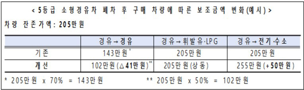 경유차 재구매 방지를 위해 보조금 지원방식도 개선한다. 배출가스 5등급 소형 경유 승용차를 폐차한 후 경유차를 재구매할 시 보조금을 차량 잔존 가액의 70%에서 50%로 축소한다. 무공해차(전기·수소차)를 신규로 구매할 시에는 보조금을 50만원 증액한다.
