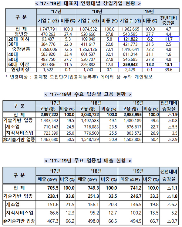 대표자 연령대별로는 20대 이하 창업자(11.7%)와 60대 이상 창업자(13.1%)가 크게 증가한 것으로 나타났다.