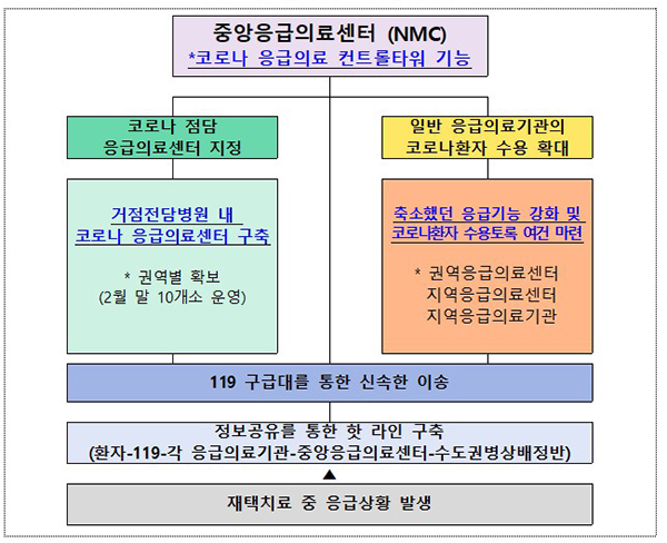 이를 위해 국립중앙의료원의 중앙응급의료센터를 중심으로 코로나19 응급의료 컨트롤타워 기능을 구축해 코로나19 응급상황을 전담 관리하고, 119 구급대와 이송 가능한 병원을 신속히 연계·조정하는 역할을 수행한다.
