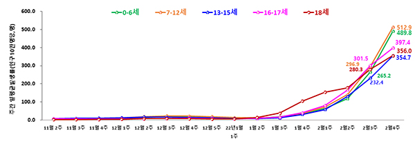 ▲ 학령기 연령군별 일평균 발생률 추이.2월 4주 18세 이하 소아·청소년 확진자는 전주 대비 1.7배 증가한 3만 6298명으로, 전주대비 증가규모는 청·장년 및 고령층과 비슷하나 10만명당 발생률은 2배 이상 높은 상황이다.