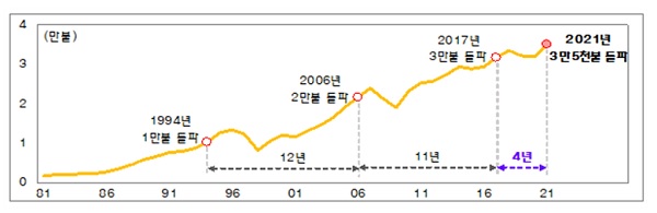 지난해 우리나라 1인당 GNI는 2017년(3만1734달러) 처음 3만달러대에 들어선 뒤 2018년 3만3564달러까지 늘었다가 2019년(3만2204달러)과 2020년(3만1881달러) 2년 연속 뒷걸음쳤다. 하지만 지난해 코로나19 충격으로부터 경기가 회복하고 원/달러 환율이 연평균 3% 떨어지면서 3년 만에 반등에 성공했다.