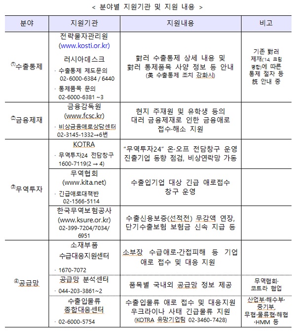 러시아·우크라이나 인근 국가에 화물보관이 필요할 경우 코트라와 협약을 맺은 현지 물류센터에 보관장소 및 내륙운송 서비스도 제공하고 소요비용에 대해 1000만원 한도 내에서 최대 70%까지 지원한다.