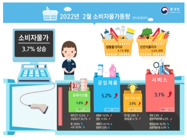 통계청이 4일 발표한 올해 2월 소비자물가 동향에 따르면 소비자물가지수는 105.30(2020년=100)으로 지난해 같은 달보다 3.7% 상승했다.