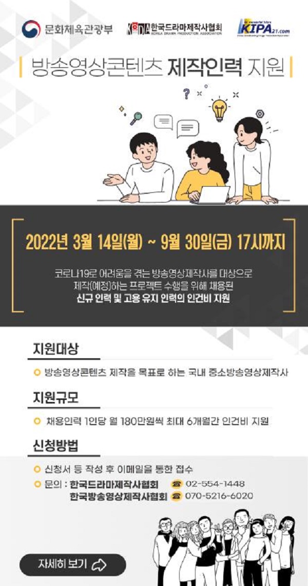 ‘방송영상콘텐츠 제작인력 지원’ 사업에 대한 참여 조건, 신청 접수, 추진 일정 등 세부적인 내용 등은 7일부터 각 협회 누리집(www.kodatv.or.kr, www.kipa21.com)에서 확인할 수 있다.