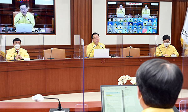 ▲ 김부겸 국무총리가 11일 서울 세종로 정부서울청사에서 열린 코로나19 중대본 회의를 주재하고 있다.(사진=국무조정실)김 총리는 “이를 위해 병상을 충분히 확보하고 효율적으로 운용하겠다”며 “현재 3만개 수준의 병상을 확보하고 있지만 이에 더해 감염병전담요양병원 등 2300여개의 병상을 속속 추가하고 코로나 치료가 끝난 환자의 경우 전원·전실을 적극 권고하는 등 확보된 병상이 효율적으로 가동되도록 노력하겠다”고 설명했다.