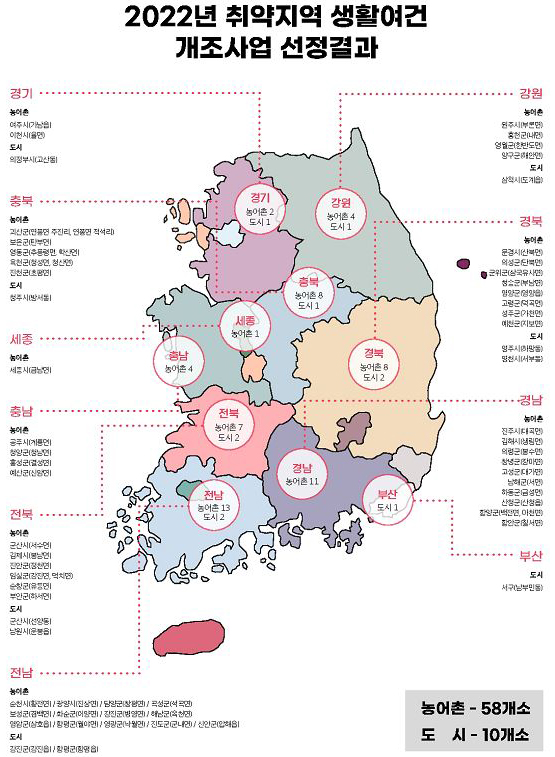 올해 신규 사업대상지는 도시 10곳, 농어촌 58곳이며 시·도별로는 전남 15곳, 경남 11곳, 경북 10곳, 충북·전북 각 9곳 등이다.