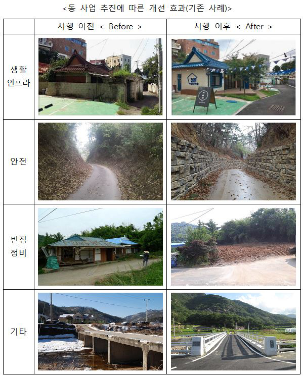 구체적으로 슬레이트 지붕 개량, 노후주택 정비 등 주택정비와 담장·축대 정비, 소방도로 확충 등 안전시설 정비, 재래식 화장실 개선, 상·하수도 정비 등 생활 인프라 확충 등이 이뤄진다.