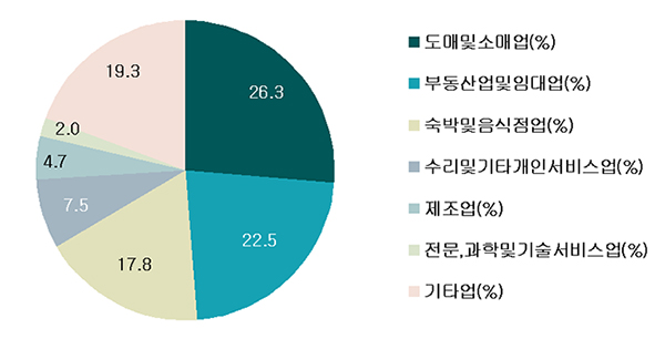 도매·소매업(26.3%), 부동산업(22.5%), 숙박·음식업(17.8%)이 전체의 66.6%로 다수를 차지하고 있지만 기술기반 업종 비중도 2015년 11.5%에서 2018년 12.2%로 증가 추세를 보이고 있다.