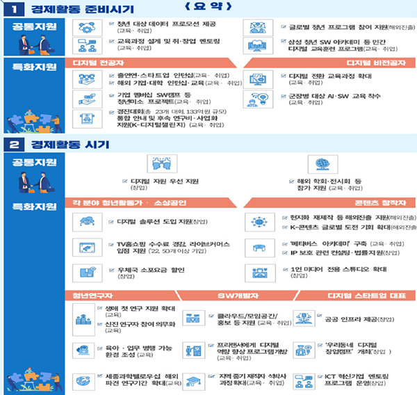 한편 과기정통부는 디지털 청년 지원정책 중 하나로 133억원 규모의 디지털 분야 경진대회 23개를 통합 브랜드화한 ‘K-디지털 챌린지’도 별도로 안내할 방침이다.