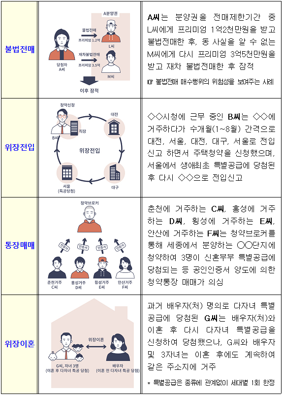 ▲ 불법전매 및 부정청약 유형별 사례.국토부는 부정청약 및 불법전매 등 공급질서 교란행위 혐의가 있는 125건에 대해 경찰에 수사를 의뢰하고 주택법 위반 시에는 형사처벌과 함께 계약취소(주택환수) 및 향후 10년 동안 주택청약자격을 제한하는 등 엄중하게 조치할 예정이다.