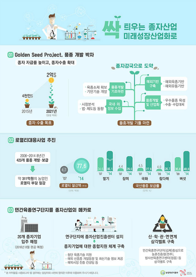 [일간환경연합 황문권 기자]농식품부와 해양수산부, 농촌진흥청, 산림청은 농림수산업의 미래성장산업화를 통하여 국민과 현장에서 공감하는 창조경제를 실현하기 위해 범국가적 종자산업 육성 정책을 협력·추진하고 있는데요. 어떤 정책들인지 함께 살펴볼까요?