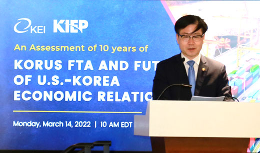 ▲ 여한구 산업통상자원부 통상교섭본부장이 14일(현지시간) 미국 워싱턴에서 열린 ‘한·미 FTA 10주년 기념 세미나’에서 인사말을 하고 있다. (사진=산업통상자원부)특히 협상 출범·타결·국회 비준과정에서의 어려움, 협정 발효 이후 트럼프 전 미국 대통령의 한미 FTA 위협 등 우여곡절 끝에 10년을 맞이한 한미 FTA의 역사를 재조명하는 한편, 한미 FTA를 기반으로 활발하게 비즈니스 활동을 하고 있는 한미 양국 기업들의 사례를 공유하는 시간을 가졌다.