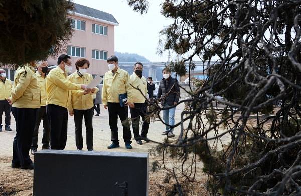 ▲ 유은혜 사회부총리 겸 교육부 장관이 지난 11일 울진산불 피해학교 긴급점검을 위해 죽변고등학교, 온양교직원사택, 울진교육지원청을 방문했다. (사진=교육부)먼저, 산불피해학교 학생들의 건강상태 확인 및 진료를 위해 ‘찾아가는 의료서비스’를 지원한다.