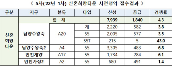 [일간환경연합 장민주 기자]올해 첫 신혼희망타운 사전청약에 8000여명이 신청해 4.3대 1의 경쟁률을 기록하며 마감됐다.