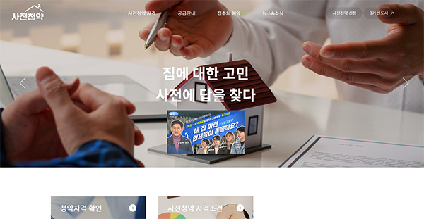 ▲ 사전청약.kr 누리집 메인화면.지구별로는 3기 신도시인 남양주 왕숙2 6.8대 1, 인천 계양 6.1대 1, 남양주 왕숙 3.8대 1 순으로 높은 청약률을 보였다.