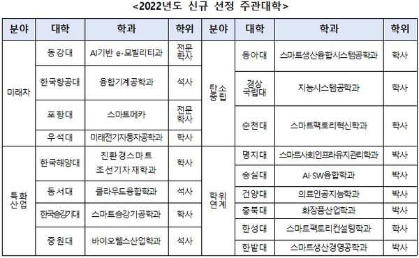 분야별로는 미래차 분야 4곳(동강대·한국항공대·포항대·우석대), 지역 특화산업 분야 4곳(한국해양대·동서대·한국승강기대·중원대), 탄소중립 분야 3곳(동아대·경상국립대·순천대), 학위연계 과정 6곳(명지대·숭실대·건양대·충북대·한성대·한밭대) 등이다.