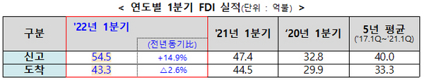7일 산업통상자원부가 발표한 ‘2022년 1분기 외국인직접투자 동향’에 따르면 신고기준 FDI는 전년 대비 14.9% 증가한 54억5000만 달러, 도착기준은 2.6% 감소한 43억3000만 달러를 기록했다. 1분기 기준으로 신고는 역대 최대 실적, 도착은 역대 2위 실적을 기록했다.