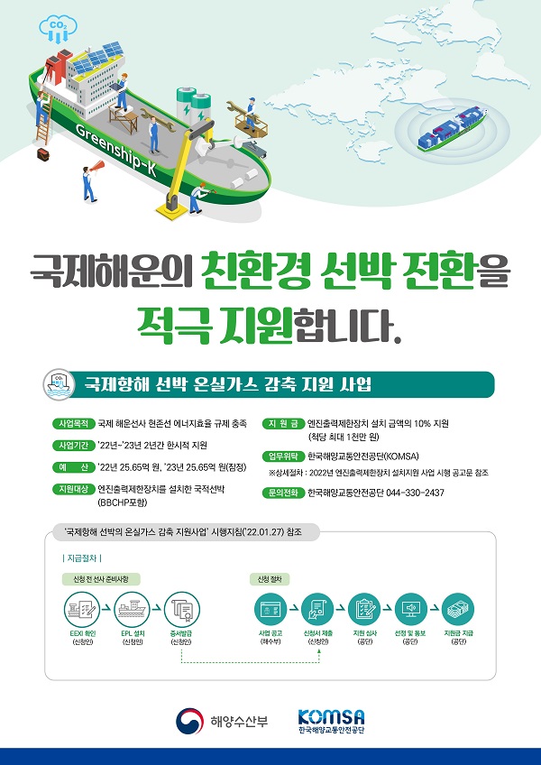 [일간환경연합 신상미 기자]해양수산부는 내년 1월부터 시행되는 국제해사기구(IMO)의 온실가스 규제를 충족하기 위해 엔진출력 제한장치를 설치하는 국내 선사에 설치비용의 10%를 지원한다고 7일 밝혔다.