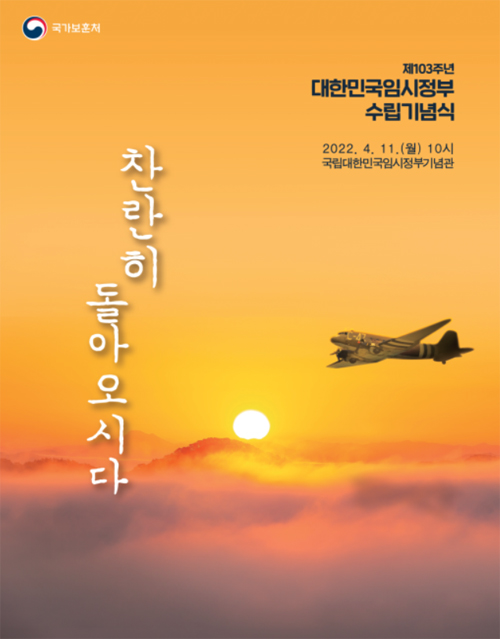 ▲ 제103주년 대한민국임시정부 수립 기념식 홍보 이미지.기념식은 여는 영상, 국민의례, 임시헌장 낭독, 기념공연(1막), 포상, 기념사, 기념공연(2막), ‘대한민국임시정부 성립 축하가’ 제창 순으로 50분 동안 진행된다.