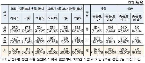우울감 및 불안감 경험 항목에서 초등학생은 코로나 이전보다 우울해지지 않음 53.9%, 모름 19.1%, 우울해짐 27.0%이라고 답변했으며 불안해지지 않음 59.5%, 모름 14.2%, 불안해짐 26.3%이라고 응답했다.