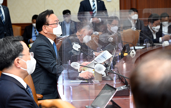 ▲ 김부겸 국무총리가 14일 정부서울청사에서 열린 제144회 국정현안점검조정회의를 주재하고 있다.(사진=국무조정실)이날 회의에서는 ‘포괄적 연금통계 개발 계획’과 ‘발달장애인 돌봄지원 강화대책’ 등 2개 안건이 논의됐다.