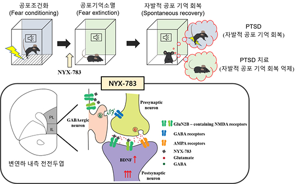 특히 우리나라 연구진은 PTSD 동물 모델에 공포 상황 24시간 후 ‘NYX-783’을 주입해 공포기억 재발이 억제됨을 확인했다. 분석 결과 변연하 내측 전전두엽 내 흥분성 신경세포의 ‘GluN2B’ 소단위체 단백질을 포함한 ‘NMDA수용체’가 활성화됐다.