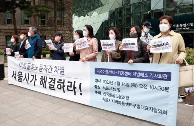 [일간환경연합 신상미 기자]전국돌봄노동조합이 14일 서울 중구 서울시청 앞에서 `아동돌봄노동자간 차별 해결 촉구 기자회견`을 가졌다.