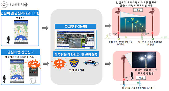 설치된 스마트 공원등은 근거리 무선통신망 기반의 IoT신호기가 부착된 LED 조명으로, 시민의 안전한 귀가를 지원하는 서울시 ‘안심이 앱’과 연계해 작동한다.