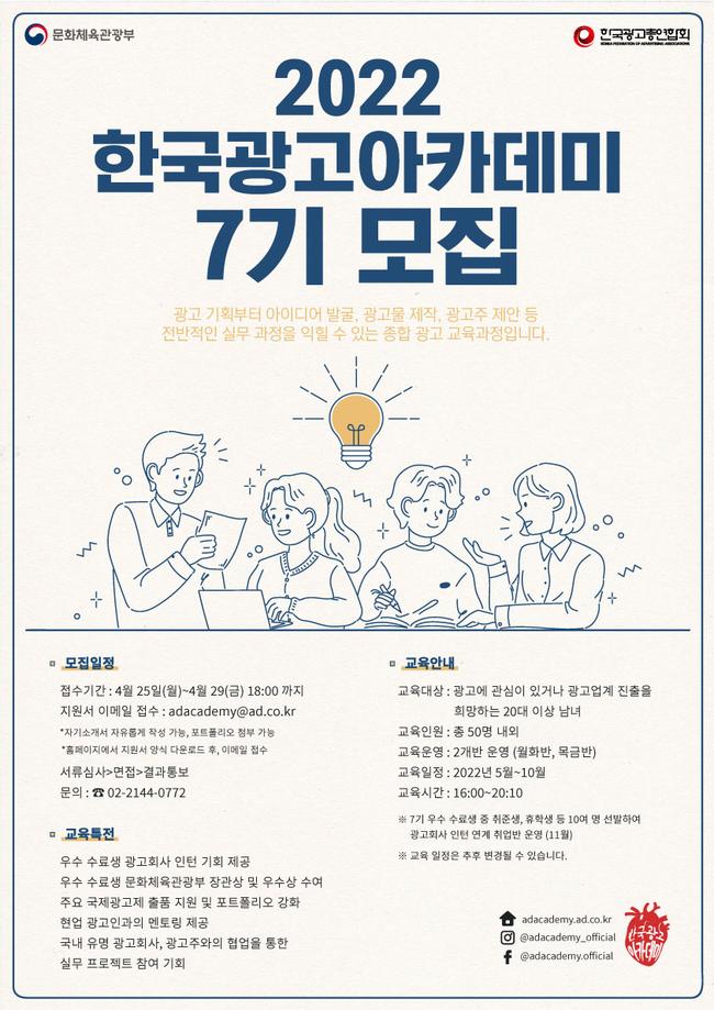 광고에 관심이 있거나 광고업계에 진출을 원하는 대학생, 취업준비생 등 20대 이상 누구나 4월 29일(금)까지 한국광고아카데미 정규과정에 신청할 수 있다. 최종 선발된 교육생 50명은 5월 말부터 약 5개월간 무료로 광고 실무교육을 받게 된다.
