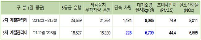 지난해 동기간 대비 단속차량은 84%감소, 대기오염물질 17%감소