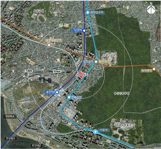 한강대로변에 위치한 사업 부지는 지하철 4․6호선 `삼각지역`과 접해 있는 데다 지하철 1호선․경의중앙선 `용산역`과도 가까워 교통이 편리하고 용산공원, 남산을 모두 바라볼 수 있는 입지적 장점을 갖추고 있다.