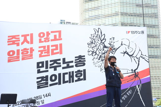 민주노총은 28일 서울고용노동청 앞에서 `죽지 않고 일할 권리 쟁취` 결의대회를 열었다.민주노총은 투쟁 결의문에서 "중대재해기업처벌법이 시행된지 3개월이 지났으나, 어제도 오늘도 하루에 7명씩 매년 2400명의 노동자가 죽는 현실은 달라지지 않았다"며 "오로지 이윤만을 앞세워 노동자를 죽음으로 몰고 가는 기업의 살인행위가 여전히 지속되고 있는 것"이라고 지적했다.
