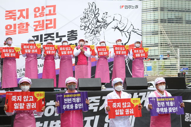 [일간환경연합 장민주 기자] 민주노총은 28일 서울고용노동청 앞에서 `죽지 않고 일할 권리 쟁취` 결의대회를 열었다.