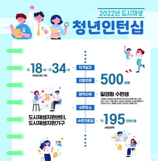 [일간환경연합 김경훈 기자] 국토교통부와 주택도시보증공사는 5.9(월)부터 ‘22년도 도시재생 청년인턴을 모집한다고 밝혔다.