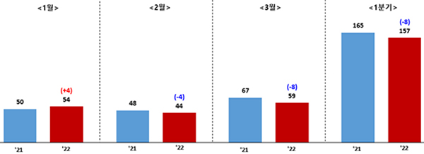 [일간환경연합 장민주 기자]올해 1분기 재해조사 사고사망자는 157명으로, 지난해 동기 대비 165명에 비해 8명이 감소한 것으로 나타났다.
