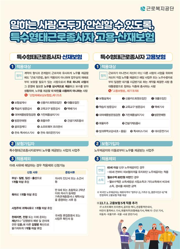 특히 지난해 7월부터 특수형태근로종사자에 대한 고용보험 가입이 의무화되었고, 올해 7월부터는 소프트웨어 프리랜서, 골프장캐디, 관광통역안내사, 어린이통학버스기사, 화물차주(유통배송기사, 택배 지·간선 기사, 자동차·곡물가루·곡물·사료 운반기사) 등 5개 직종을 적용 대상으로 추가해 시행한다.