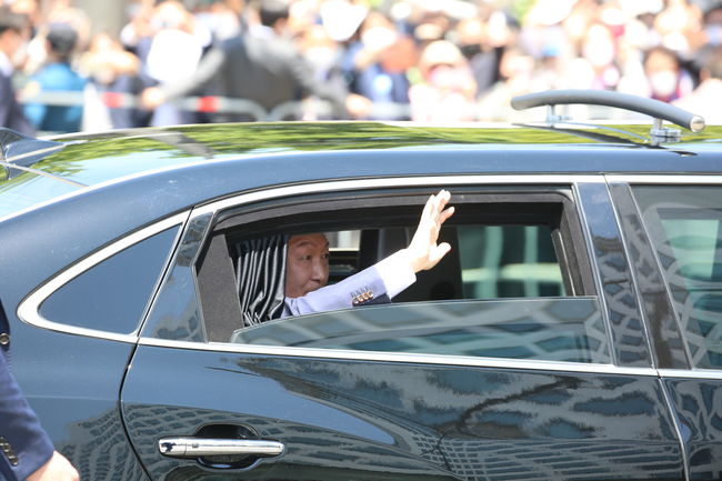 취임식을 마치고 의전차량에 탑승한 윤 대통령이 연도 시민들에게 손을 들어 화답하고 있다.국민대표 20명과 함께 연단에 오른 윤 대통령은 "존경하고 사랑하는 국민 여러분, 750만 재외동포 여러분, 그리고 자유를 사랑하는 세계 시민 여러분. 저는 이 나라를 자유민주주의와 시장경제 체제를 기반으로 국민이 진정한 주인인 나라로 재건하고, 국제사회에서 책임과 역할을 다하는 나라로 만들어야 하는 시대적 소명을 갖고 오늘 이 자리에 섰습니다"라고 취임사 낭독을 시작했다.