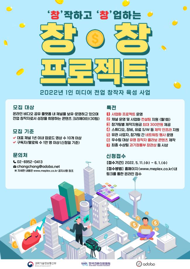 과학기술정보통신부(이하 `과기정통부`)와 한국전파진흥협회는 올해 1인 미디어 전업 창작자 육성 사업을 공고하고, 참가자(팀)를 5월 11일부터 6월 1일까지 모집한다.