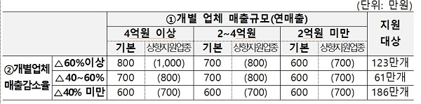 업종별 특성까지 고려해 매출 40% 이상 감소 업종, 방역조치 대상 중기업은 700만원에서 최대 1000만원까지 지원한다.