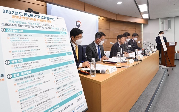 이번 추경은 ▲소상공인에 대한 온전한 손실보상( 26조3000억원) ▲방역 보강 및 향후 일반 의료체계 전환 지원(6조1000억원) ▲고물가, 산불 등에 따른 민생안정 지원(3조1000억원) ▲하반기 코로나 재유행 등에 대비한 예비비 보강(1조원) ▲초과세수에 따른 법정 지방이전지출(23조원) 등으로 짜여졌다.