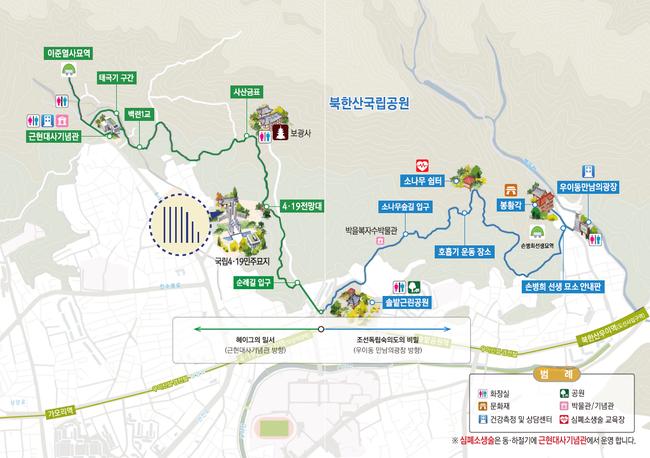 A코스는 약 3.1km의 북한산둘레길 1구간으로 솔밭공원에서 시작해 봉황각과 우이동 만남의 광장으로 향한다. B코스는 2.3km의 북한산둘레길 2구간으로 4·19전망대와 근현대사기념관을 지나 이준열사묘역에서 끝난다.