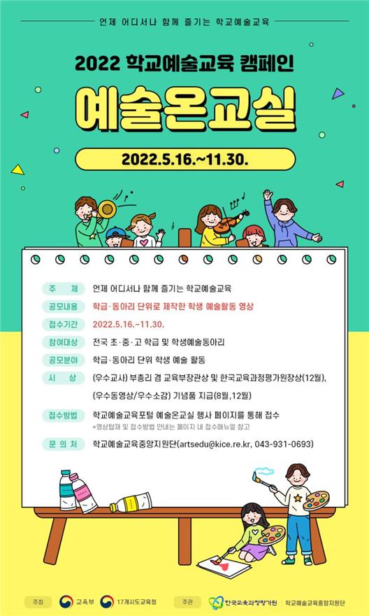 교육부와 한국교육과정평가원은 5월 16일(월)부터 11월 30일(수)까지, 2022 학교예술교육 캠페인 `예술온교실`을 실시한다고 밝혔다.
