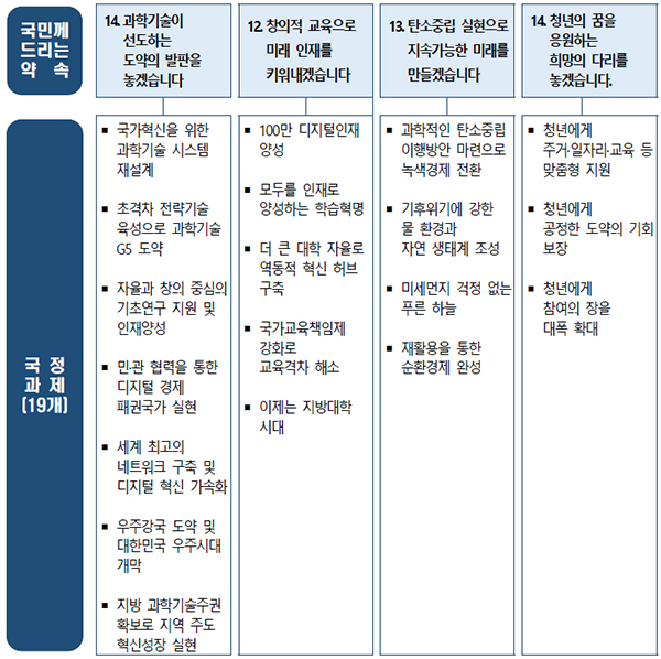 자율과 창의의 탄탄한 밑거름을 자양분 삼아 도전과 혁신의 과학기술 혁명, 창의적 인재를 키우는 미래 교육을 준비한다. 또 기후환경위기가 미래의 기회로 바뀌고 청년들의 꿈과 도전이 대한민국의 새로운 원동력이 될 수 있도록 도약의 발판을 마련한다.