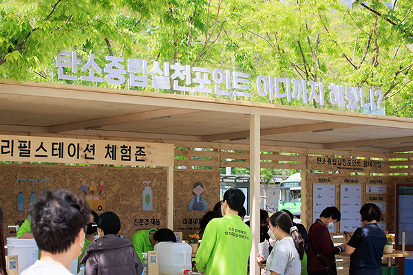 ▲ 지난달 26일 서울광장에 설치된 탄소중립실천포인트 전시관에서 시민들이 체험프로그램에 참여하고 있다.(사진=문화체육관광부 국민소통실)새 정부는 탄소중립 실현을 위해 과학적인 이행방안을 마련하고 녹색산업·기술을 기반으로 녹색투자와 소비를 촉진하는 경제 생태계를 조성할 계획이다. 구체적으로 탄소중립 이행방안을 조정, 부문별로 현실적 감축수단을 마련해 법정 국가계획에 반영한다. 지자체 탄소중립지원센터 설립·운영을 확대하고 지역별 대표모델로 탄소중립 그린도시 확산에도 나선다. 탄소중립 실천포인트 등 인센티브 강화로 범국민 생활실천도 확대하기로 했다.